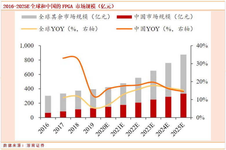 根据Frost&Sullivan 数据,2022 年全球FPGA 市场规模为79.4 亿美元,2025 年将达到125.8 亿美元,CAGR 为16.6%;2022 年中国FPGA 市场规模为208.8亿元,目前占到全球市场比重约37%,2025 年将达到332.2 亿元,CAGR 为16.7%。
