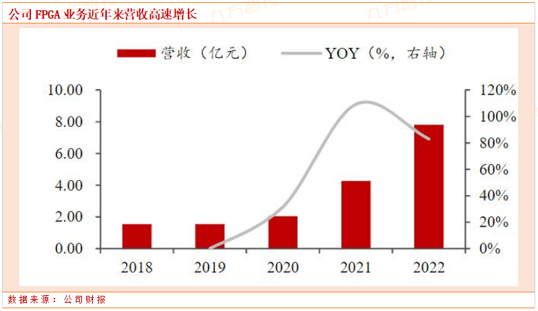 公司FPGA及其他产品业务的销售收入从2018年的1.55亿元增长至2022 年的7.81 亿元,2021年、2022年增速分别为109.31%、82.90%,占主营业务比例从10.96%提升至22.25%。