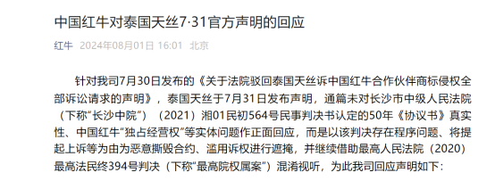 7月30日,中国红牛在官方渠道发布声明称,长沙中院相关民事判决书7月29日已驳回泰国天丝起诉中国红牛长沙经销商华厦糖酒公司商标侵权的全部诉讼请求。