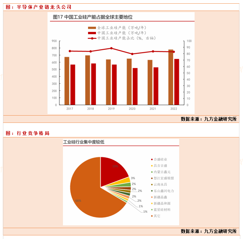 2017-2022年,中国工业硅产能在全球工业硅产能占比始终保持在79%以上,占据全球主导地位。2021年,中国工业硅产能528万吨/年,全球工业硅产能632万吨/年。2022年,中国工业硅产能增长至646万吨/年,全球工业硅产能增长至778万吨/年,中国新增产能达到118万吨/年,占全球新增产能的80.82%。从产能分布来看,中国、巴西、美国、挪威、法国、俄罗斯以及德国是全球 主要的工业硅产地,2022年前十大生产国产能占全球总产能的96.08%。工业硅行业集中度较低,合盛硅业产能位居行业首位。根据百川盈孚数据显示,2022年我国工业硅行业总产能646万吨/年, CR4仅26%,其中合盛硅业以122万吨/年的产能位居行业首位,占比19%,占据行业龙头地位。工业硅行业是一个作为高耗能行业,主要集中分布在电力资源充沛的西北、西南地区。由于电力成本在工业硅生产成本的占比较大,整个产业链中重要驱动逻辑:1:电力能源费用(占据工业硅成本40%) 2:工业硅供需,3:有机硅供需。