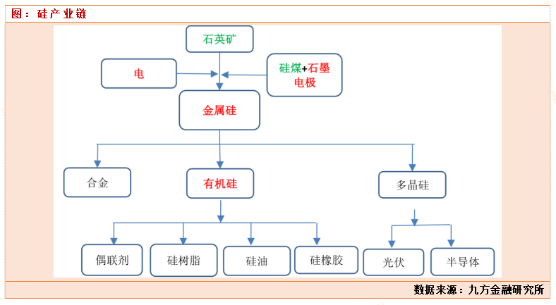 硅产业链,上游是开采,中游是炼化得到金属硅(工业硅,98%的硅含量,粗硅),下游分布较广,分为合金,有机硅,多晶硅。不同于铝合金等合金冶炼,有机硅化合物,半导体,光伏产业链。工业硅由硅石和还原剂在电弧炉中通过冶炼获得,是多晶硅、有机硅和硅铝合 金的主要原料。工业硅又称金属硅或结晶硅,是指以含氧化硅的硅石和碳质还原剂等为主要原料按一定的配比称量,通过石墨电极及电弧热将炉料加热到 2000℃以上, 二氧化硅被碳还原剂还原生成工业硅液体,在硅水包底部通入氧气、空气混合气体,以除去钙、铝等其他杂质。工业硅作为硅化工的主要原材料,下游应用于多晶硅,有机硅和硅铝合金中。