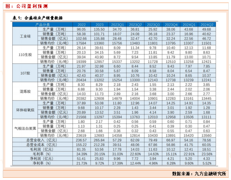 合盛硅业2024 年 H1 实现营业收入为 132.72 亿元,同比+11.18%;实现归母净利润 9.78 亿元, 同比下降 45.12%;实现扣非归母净利润 8.99 亿元,同比下降 43.54%; 销售毛利率 23.30%,同比下降 3.35pct,销售净利率 7.18%,同比下降 7.63pct。2024Q2,公司销售工业硅 40.62 万吨,环比+139.55%;公司销售 110 生胶 8.63 万吨,环比-12.01%;销售 107 胶 8.47 万吨,环比+29.61%; 销售混炼胶 2.06 万吨,环比+1.88%;销售环体硅氧烷 1.28 万吨,环比 -33.24%。202目前金属硅 553 均价为 12935 元/吨,有机硅 DMC 均价为 13712 元/吨,价格都处于历史低位,通过前文分析,我们知道行业产能的过剩和下游经济需求的疲弱,导致工业硅价格低迷,但是好的面是,目前国家不断刺激经济,下游硅料行业也触底回升,价格有望回升,带动工业硅景气回升。根据预计机构预测,公司 2024年营业收入为 280亿元,归母净利润分别为 24-25亿。目前公司768亿市值,30倍估值,相对远期和行业低位看,公司市值属于相对低位状态。