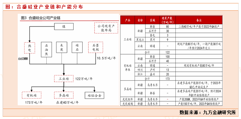 公司的主要产品包括工业硅及有机硅产品两大类。工业硅由硅石和还原剂在矿热炉内冶炼而成,广泛应用于光伏、有机硅、硅铝合金等行业。有机硅是指含有Si-C键、且至少有一个有机基是直接与硅原子相连的化合物,主要分为硅橡胶、硅油、硅树脂和硅烷偶联剂四大类。 公司现有工业硅产能122万吨/年,行业占比19%,有机硅单体产能173万吨/年,行业占比30%,均居行业首位。主要产能分布在煤炭资源丰富的新疆地区并自备热电厂,奠定了公司的成本竞争优势。