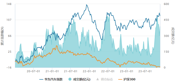 2023年十月起,自动驾驶板块行情自华为问界新M7卖爆而开启,市场经历了华为鸿蒙、智能座舱、复合集流体、激光雷达、无人泊车等数个分支概念轮动,至11月27日,四季度东财无人驾驶概念板块已涨超10%。万得华为汽车概念指数和成分股成交额也均回到历史高位。