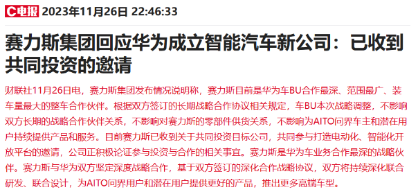 此前华为、长安和宁德时代共同投资的HI模式车型阿维塔已经量产交付,而对于华为其它的车企合作方,华为智能汽车解决方案BU董事长余承东表示:“还会与更多战略伙伴车企一起携手合作”。华为车BU目前最深度合作伙伴赛力斯表示,已收到共同投资华为智能汽车新公司的邀请。