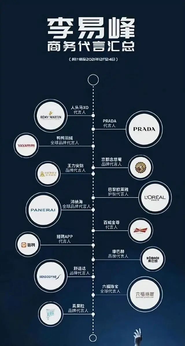 2020年至今,其商业代言超过10个,其中不乏HONMA高尔夫品牌、人头马、六福珠宝等知名品牌。而目前李易峰相关作品已被陆续除名,代言开始下架。