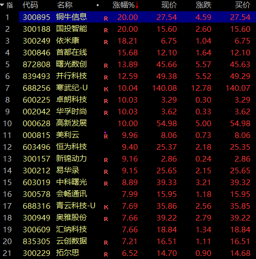 数字经济概念早间全线高开高走,其中东数西算板块盘中放量大涨逾5%,半日成交超昨日全天成交。铜牛信息、国投智能双双高开后秒速20%涨停,美利云则开盘一字涨停,依米康、首都在线、卓朗科技等亦强势涨停或涨超10%。