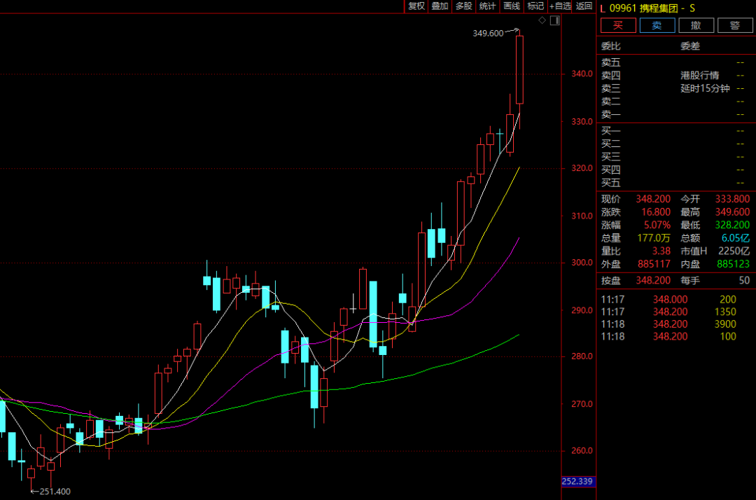 港股旅游股也强势上涨,携程集团放量高开高走涨逾5%,股价创历史新高,专业旅运、佳民集团、特海国际等涨幅居前。