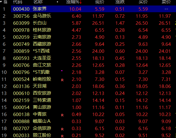 旅游股早间集体异动,板块指数盘中一度放量拉升涨逾3%。张家界仅用不到5分钟时间,就由微涨1个点左右直线拉至涨停,金马游乐、长白山、桂林旅游等纷纷大涨。