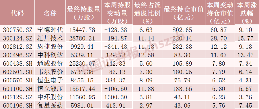 从持仓市值变动情况来看,本周北向资金对11只股票的持仓市值增加超过5亿元,对宁德时代、汇川技术、恩捷技术持仓市值增加金额分别为60.87亿元、28.70亿元、12.12亿元。