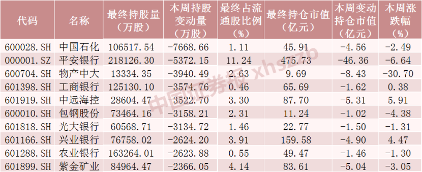 从市场表现看,本周北向资金减仓股数居前十股中仅有工商银行、中远海控、兴业银行分别上涨0.38%、5.91%、4.47%,其他股票本周均下跌,物产中大跌幅最大,累计下跌30.70%。