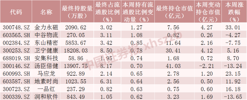 从持有流通股比例情况来看,本周北向资金仅对金力永磁、中谷物流的持有流通股比例增加1个百分点以上,分别增加1.27个百分点、1.08个百分点。