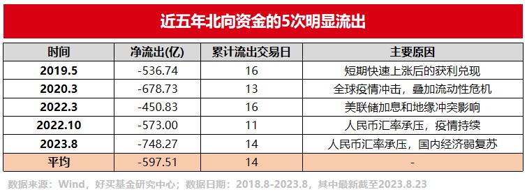 回顾历史,近五年北向资金曾有5次明显流出,分别为2019年5月、2020年3月、2022年3月及10月和2023年8月。5次流出当中,又以本次北向资金流出量为最高。