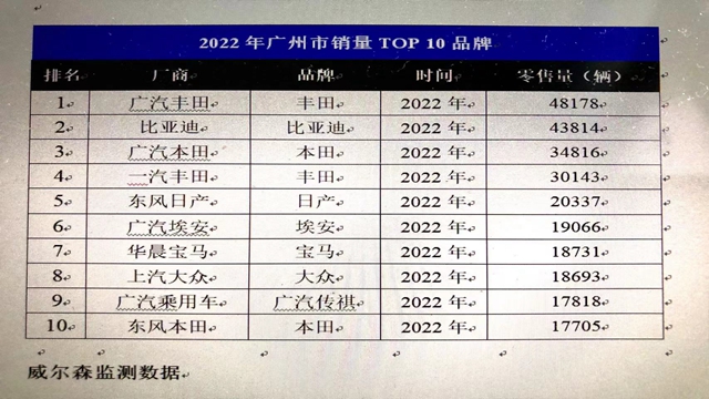 此前,广汽本田、广汽丰田以及东风日产等主流日系合资车企在广州车市长期霸榜。2019年,本田、丰田和日产品牌包揽了广州车市销量前三名,当年比亚迪排名第七。而随着新能源车越战越勇,广州车市各大品牌座次在过去三年里发生明显的变化。据威尔森的数据,在广州销量排名前十的厂商中,广汽丰田、比亚迪分别以4.8万辆和4.4万辆超过广汽本田,夺得广州市场冠、亚军,广汽本田以3.5万辆退居第三,一汽丰田、东风日产和广汽埃安分别以3.0万辆、2.0万辆和1.9万辆的销量位居第四至第六。连强势的日系合资品牌在其原先固若金汤的广州市场都正被比亚迪等自主品牌电动车一步步蚕食。