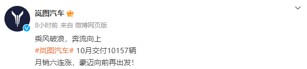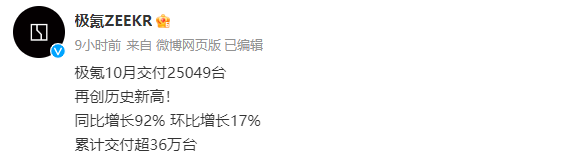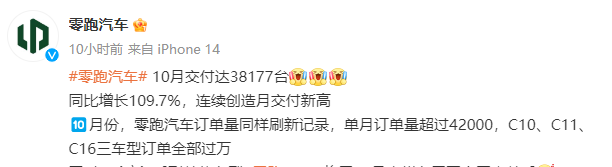 零跑汽车10月交付达38177辆,同比增长109.7%。