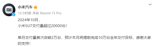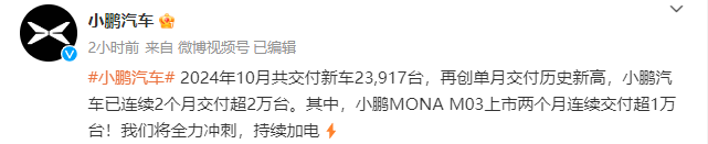 小鹏汽车10月交付新车23917辆,同比增长20%。
