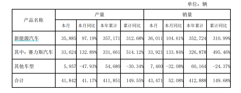 赛力斯10月新能源汽车销量36011辆,同比增长104.61%。