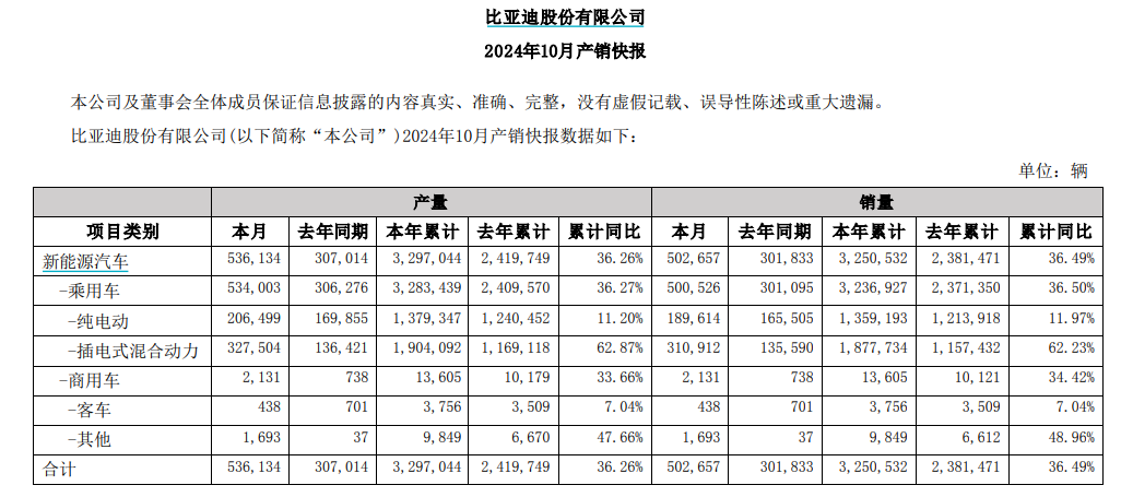 具体来看,比亚迪10月新能源车销量502657辆,上年同期为301833辆,同比增长66.5%。其中乘用车纯电动189614辆,插电式混合动力310912辆。今年1—10月,比亚迪乘用车销量323.7万辆,比上年同期增长36.5%。