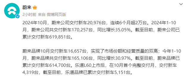 理想汽车10月交付新车51443辆,同比增长27.3%。