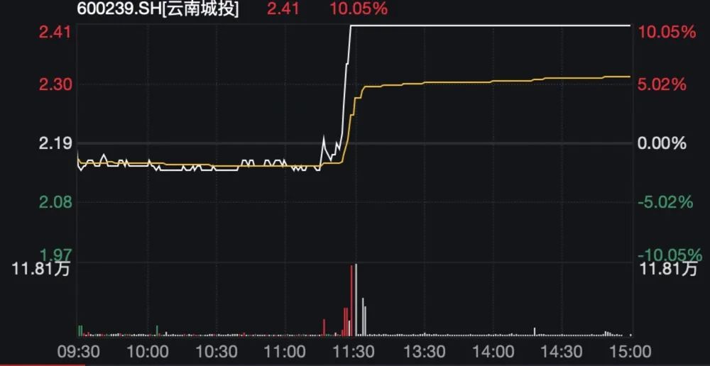 今日部分地产股盘中出现异动,如云南城投盘中直线拉升涨停,截至收盘,仍封住涨停板,报2.41元/股。