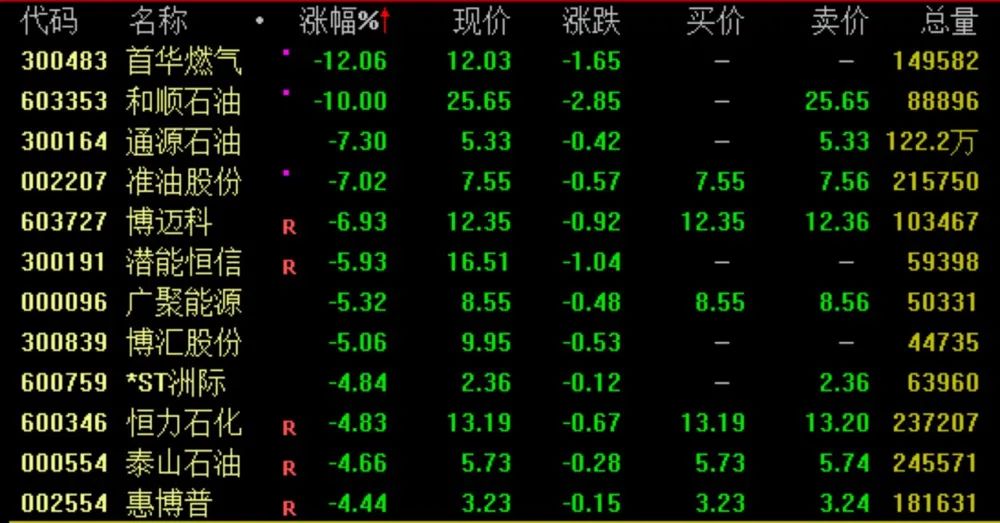 石油、有色、化工、电力、钢铁、燃气等资源股今日集体下挫。截至收盘,石油板块方面,首华燃气跌约12%,和顺石油跌停,通源石油、准油股份跌超7%。
