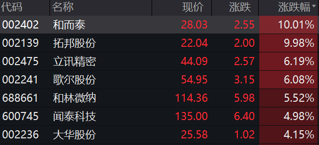 今日电子制造表现强势,指数大涨3.36%,和而泰、拓邦股份等概念股收获涨停板,歌尔股份、立讯精密、和林微纳等股涨幅居前。
