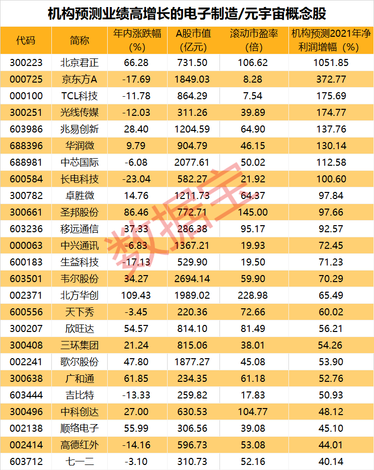 数据宝统计,从业绩增长性来看,排除掉三季报业绩不佳的概念股后,机构预测今年业绩增长幅度超40%的概念股有25只,北京君正、京东方A、TCL科技、光线传媒的今年净利润有望翻倍增长。北京君正近日在接受机构调研时表示,目前看智能视频芯片、部分存储芯片、模拟芯片等供应链仍旧比较紧张,公司在努力争取更多的产能来保证客户的需求;公司今年ISSI产能比较缺的是SRAM、Flash和Analog产品线,明年产能预计会有所提高。
