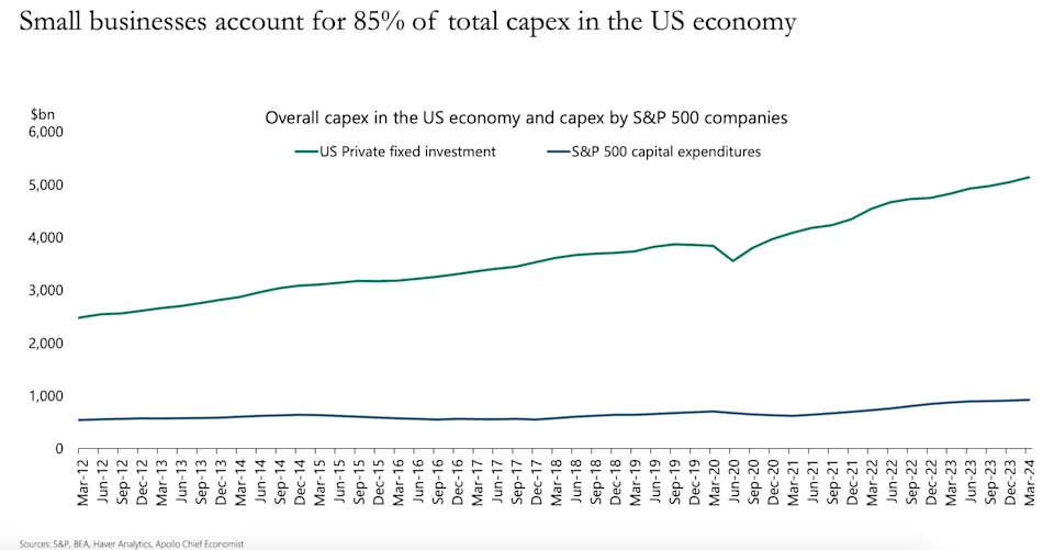 其次,小型企业的投资也比大型企业多。美国经济分析局(Bureau of Economic Analysis)的数据显示,2024年第一季度,美国私人固定投资约为4.2万亿美元。相比之下,根据阿波罗的分析,标准普尔500指数成分股公司当季的资本支出在1万亿美元左右徘徊。
