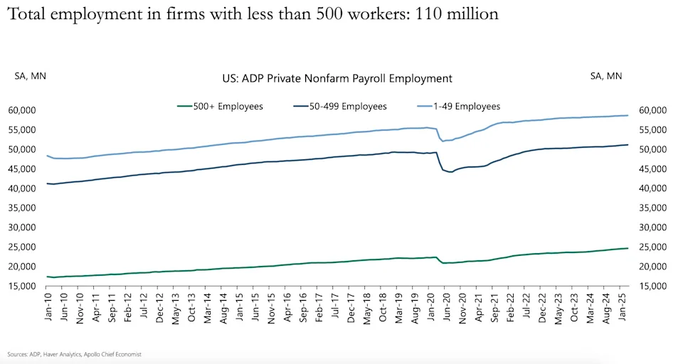 首先,小企业提供了美国大部分的就业机会。截至今年1月,员工人数少于500人的企业创造了约1.1亿个就业岗位。阿波罗的分析显示,这大约是员工人数超过500人的企业的四倍。