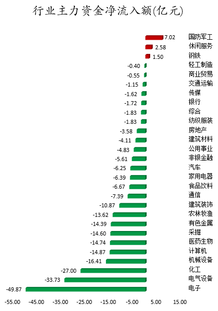 从行业板块来看,申万所属的28个一级行业,今日仅有国防军工、休闲服务、钢铁3个行业板块主力资金呈现净流入,净流入金额分别为7.02亿元、2.58亿元、1.5亿元。25个行业板块主力资金呈现净流出,其中,电子行业板块主力资金净流出最多,净流出金额为49.87亿元;行业板块主力资金净流出靠前的还有电气设备、化工、机械设备、计算机、医药生物、采掘,净流出金额分别为33.73亿元、27亿元、16.41亿元、14.87亿元、14.74亿元、14.6亿元。