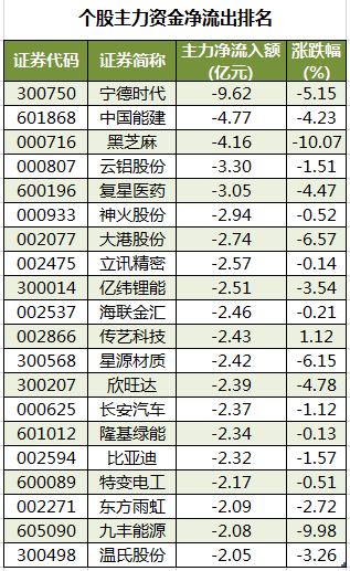 此外,3128只个股被主力资金净卖出,其中,54股被主力资金净卖出超1亿元。主力资金净流出最多的个股是宁德时代,净流出金额为9.62亿元;主力资金净流出居前的个股还有中国能建、黑芝麻、云铝股份、复星医药、神火股份,净流出金额分别为4.77亿元、4.16亿元、3.3亿元、3.05亿元、2.94亿元。