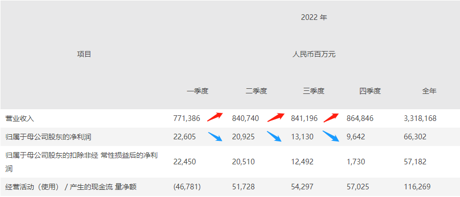 具体到季度数据来看,2022年第一季度至第四季度营业收入分别为7713.86亿元、8407.40亿元、8411.96亿元、8648.46亿元,净利润分别为226.05亿元、209.25亿元、131.30亿元、9642亿元。可以明显看到,中国石化去年营业收入逐季增加,而净利润逐季减少,尤其进入下半年净利润回落更加明显。