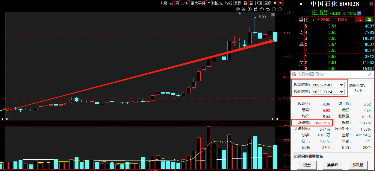 股价表现来看,截至3月24日,中国石化2023年累计涨幅26.61%,而同期上证指数涨幅为5.71%。