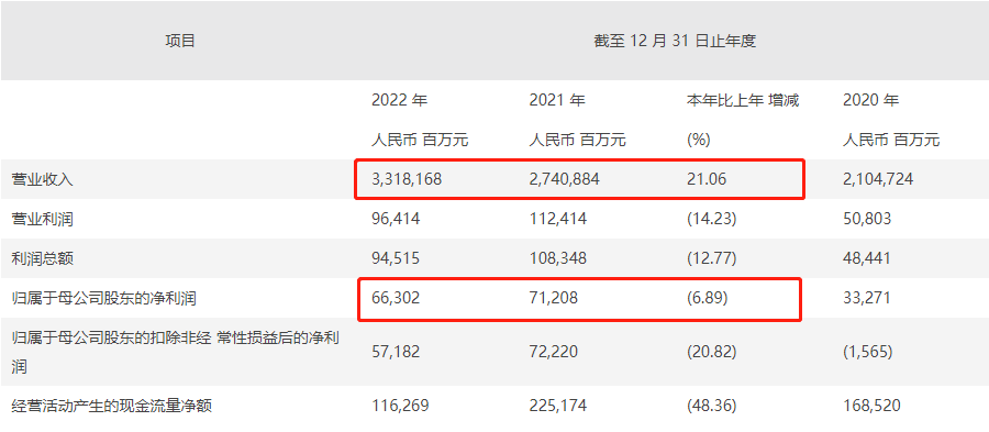 中国石化年报显示,2022年,中国石化实现营业收入3.32万亿元,同比增长21.06%;实现归属于母公司股东的净利润663.02亿元,同比下降6.89%。