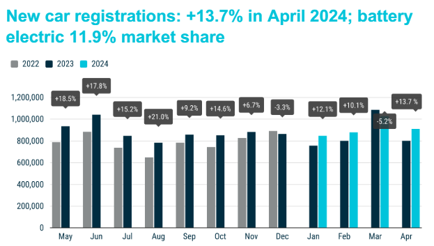 当地时间周三(5月22日),欧洲汽车制造商协会(ACEA)公布了月度新车注册报告。数据显示,欧盟今年4月份新车注册量达到913,995辆,较2023年3月份的数据高了13.7%,是去年10月以来的最大同比增幅。