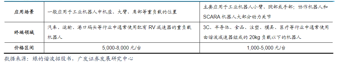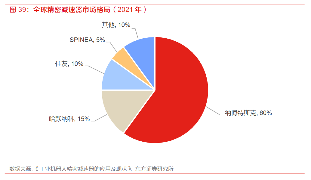 不过值得注意的是,目前来看,不论是RV减速器市场还是谐波减速器市场,仍由日本厂商所垄断。RV减速器巨头日本纳博特斯克约占60%的全球减速器市场份额,谐波减速器龙头哈默纳科约占15%的全球减速器市场份额。国内企业中,绿的谐波在谐波减速器领域实现较大突破,秦川机床、双环传动、中大力德等企业在RV减速机领域快速发展。