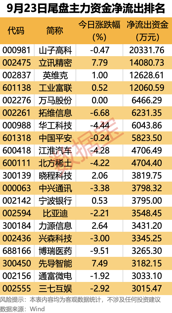 山子高科尾盘主力资金净流出超2亿元,居首;还有立讯精密、英维克、工业富联、万马股份等尾盘净流出金额居前。
