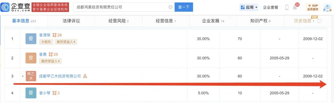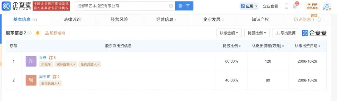 进一步来看,鸿美投资法定代表人为曾勇,注册资本仅200万元,而成都甲乙木投资有限公司(以下简称甲乙木投资)认缴金额为60万元。按图索骥,甲乙木投资成立于2006年10月,注册资本同样为200万元,其股东为乔愚和周玉琼,两者分别出资120万元及80万元。