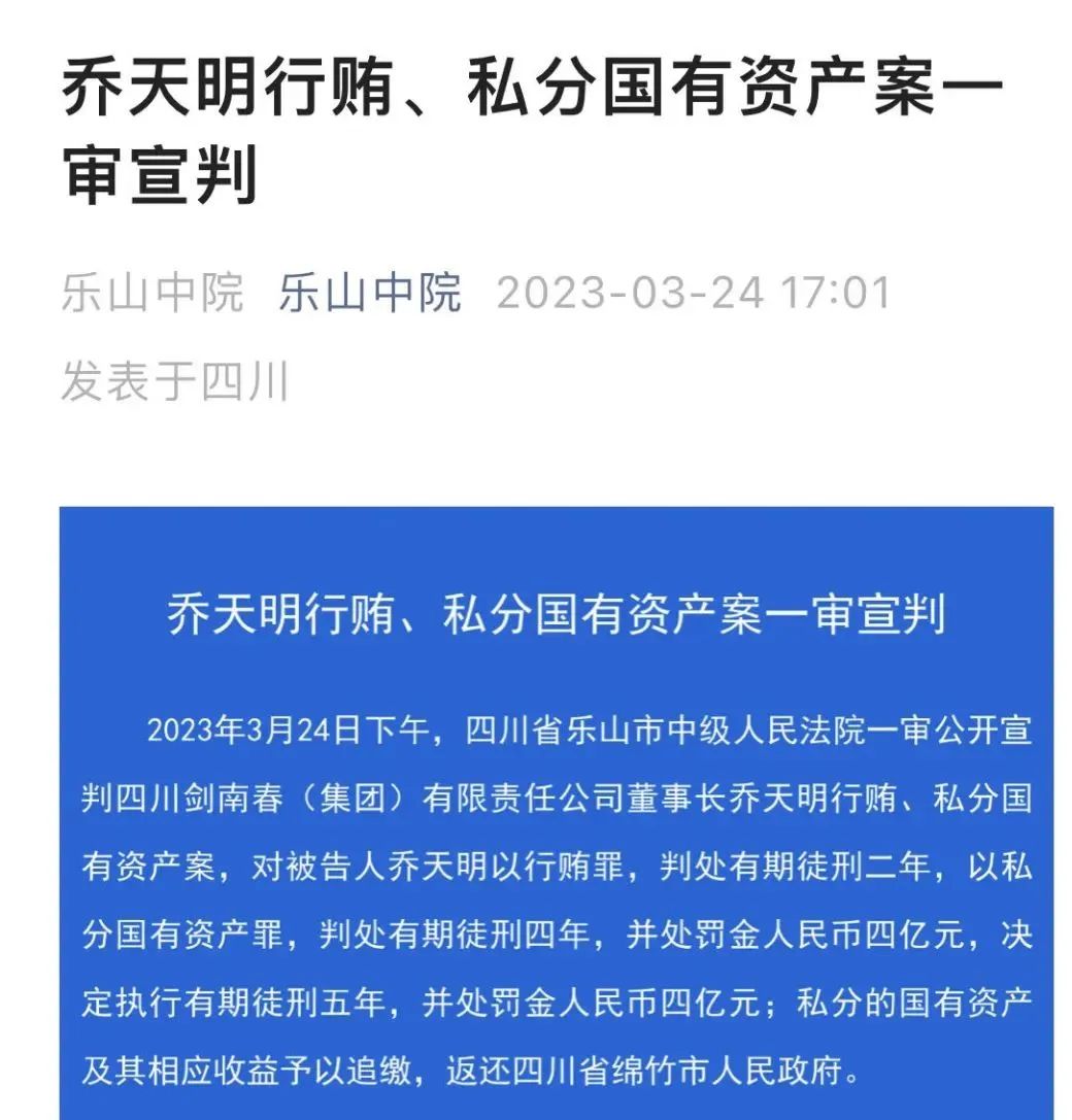 经过数年等待之后,2023年3月24日晚间,乐山中院官方微信公众号发布消息,乐山中院当天下午一审公开宣判乔天明行贿、私分国有资产案,对被告人乔天明以行贿罪,判处有期徒刑二年,以私分国有资产罪,判处有期徒刑四年,并处罚金人民币四亿元,决定执行有期徒刑五年,并处罚金人民币四亿元;私分的国有资产及其相应收益予以追缴,返还四川省绵竹市人民政府。