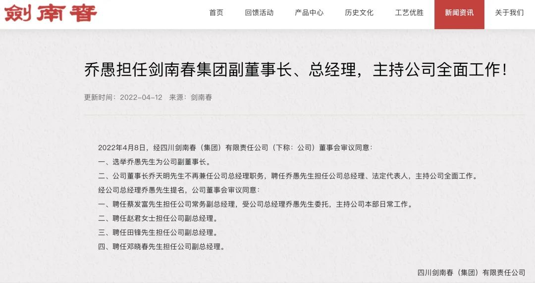 2022年4月12日,剑南春官方发布信息称,乔愚担任剑南春集团副董事长、总经理,主持公司全面工作。据悉,2021年剑南春营业收入就已突破200亿元。