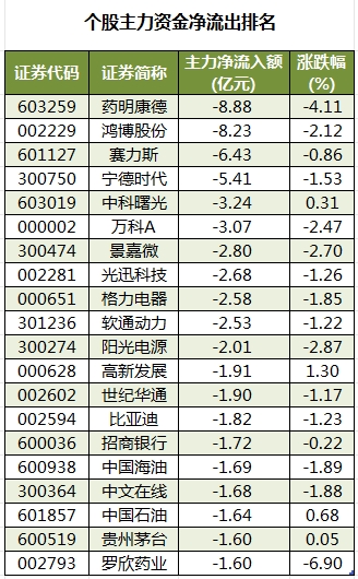 此外,2807只个股被主力资金净卖出,其中,34股被主力资金净卖出超1亿元。主力资金净流出最多的个股是药明康德,净流出金额为8.88亿元;主力资金净流出居前的个股还有鸿博股份、赛力斯、宁德时代、中科曙光、万科A,净流出金额分别为8.23亿元、6.43亿元、5.41亿元、3.24亿元、3.07亿元。