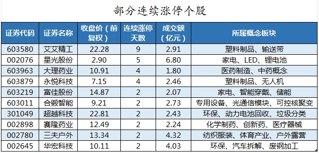 截至收盘,沪深两市合计4150只个股上涨,857只个股下跌,平盘个股96只,停牌的个股7只。不含当日上市新股,共有84只个股涨停,1只个股跌停。连续涨停天数看,艾艾精工已连收9个涨停板,连续涨停板数量最多。