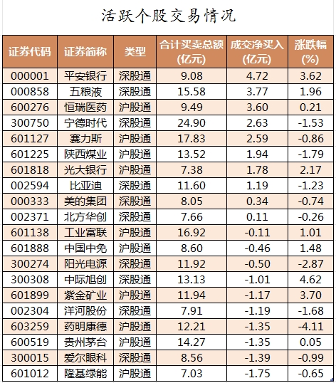 活跃个股方面,北向资金今日净买入较多的有平安银行、五粮液、恒瑞医药、宁德时代、赛力斯,净买入金额分别为4.72亿元、3.77亿元、3.6亿元、2.63亿元、2.59亿元。北向资金净卖出较多的有隆基绿能、爱尔眼科、贵州茅台、药明康德、洋河股份,净卖出金额分别为1.75亿元、1.39亿元、1.35亿元、1.35亿元、1.19亿元。