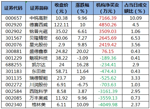 盘后龙虎榜数据显示,今日机构席位资金合计净买入约7768.99万元。其中,净买入的个股6只,净卖出的个股8只。机构净买入最多的股票是中钨高新,净买入金额约7166.39万元;机构净买入居前的还有德赛西威、铭普光磁等股。机构净卖出最多的股票是格林美,净卖出金额约4049.98万元;机构净卖出居前的还有万丰奥威、西陇科学等股。