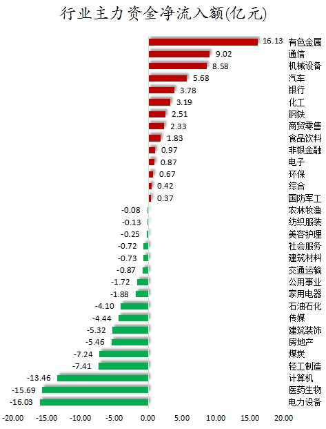 从行业板块来看,申万所属的31个一级行业,今日有14个行业板块主力资金呈现净流入,其中,有色金属行业板块主力资金净流入最多,净流入金额为16.13亿元;行业板块主力资金净流入居前的还有通信、机械设备、汽车,净流入金额分别为9.02亿元、8.58亿元、5.68亿元。17个行业板块主力资金呈现净流出,其中,电力设备行业板块主力资金净流出最多,净流出金额为16.03亿元;行业板块主力资金净流出靠前的还有医药生物、计算机、轻工制造、煤炭、房地产,净流出金额分别为15.69亿元、13.46亿元、7.41亿元、7.24亿元、5.46亿元。