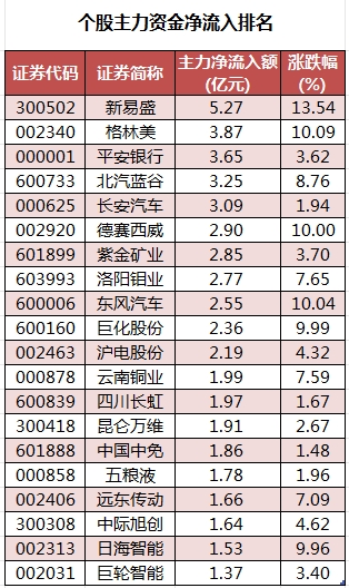 个股来看,今日有2291只个股获主力资金净流入,其中,36股获主力资金净流入超1亿元。新易盛主力资金净流入最多,净流入金额为5.27亿元;主力资金净流入居前的个股还有格林美、平安银行、北汽蓝谷、长安汽车、德赛西威,流入金额分别为3.87亿元、3.65亿元、3.25亿元、3.09亿元、2.9亿元。