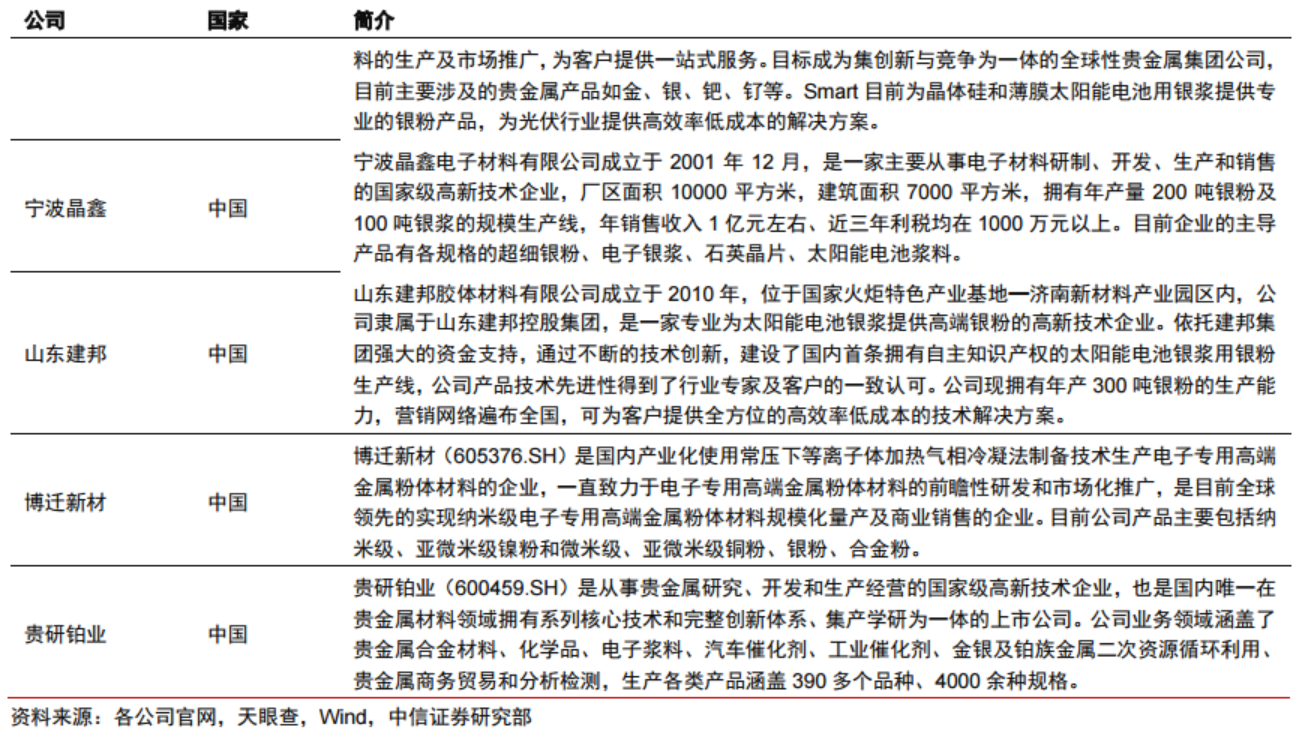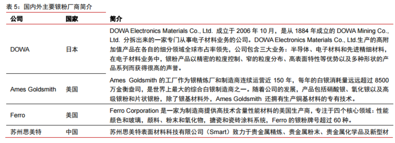 由于高质量的银粉生产具有一定的技术壁垒,全球高品质银粉供应商相对集中,主要包括日本DOWA、美国AMES等,国产银粉在整体性能上仍与DOWA银粉仍存在一定差距。国内涉及的上市公司有博迁新材、贵研铂业等。