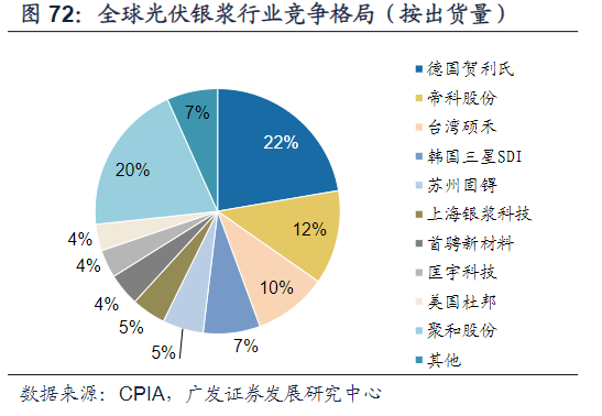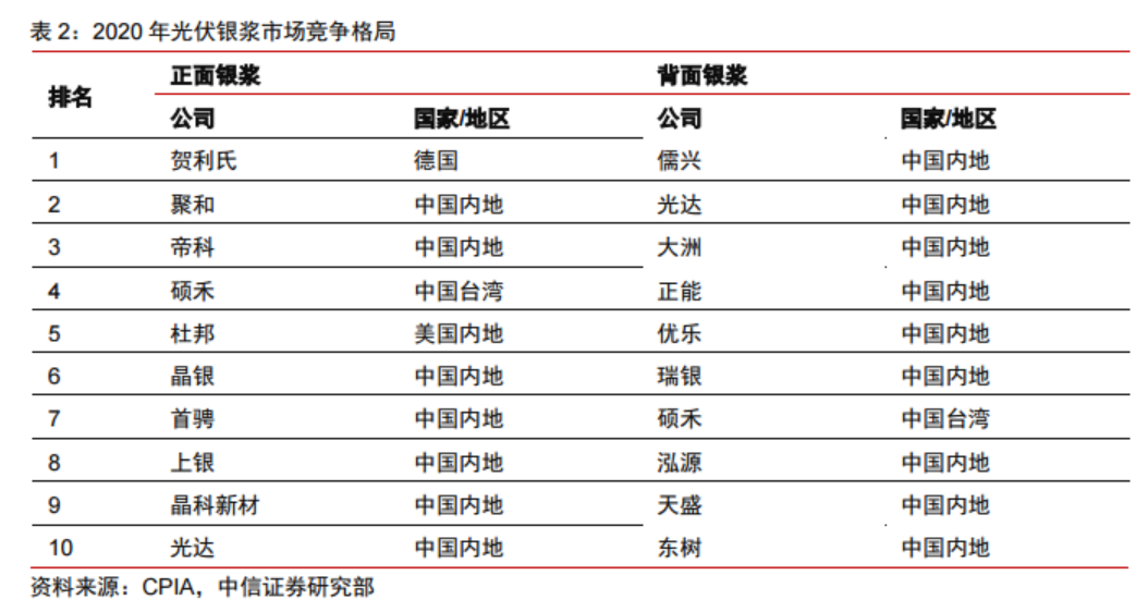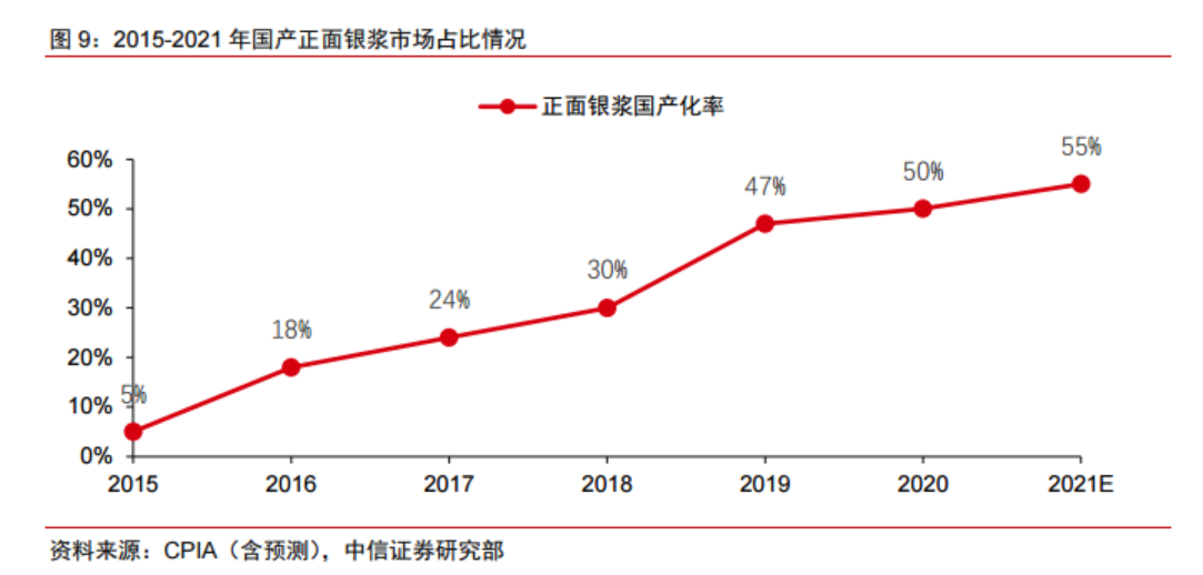 国内方面,随着国产浆料企业与本土电池企业的紧密合作,国产替代步伐提速。根据CPIA的调研数据,国产正面银浆市场占有率由2015年的5%左右上升至2020年的50%左右,预计2021年有望进一步提升至55%。背面银浆的技术难度低于正面银浆,目前背面银浆已基本实现国产化。
