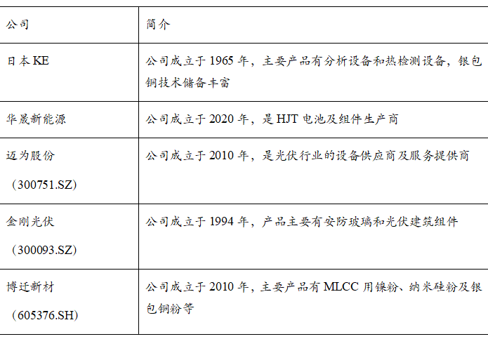 银包铜主要标的公司有日本KE、华晟新能源、迈为股份、金刚光伏和博迁新材等。