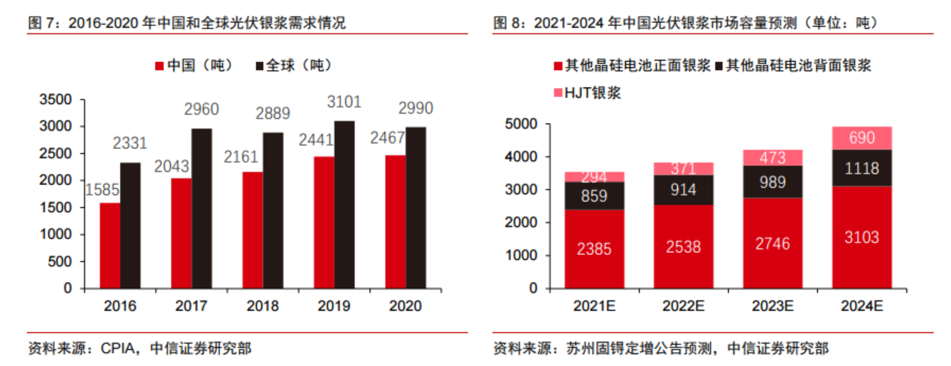 根据CPIA,2020年全球和中国光伏银浆需求分别为2990吨和2467吨,2016-2020年需求CAGR分别为6.4%和11.7%。根据苏州固锝的测算,预计中国光伏银浆市场容量将由2021年的3538吨增长至2024年的4911吨,2021-2024年的CAGR为11.6%。